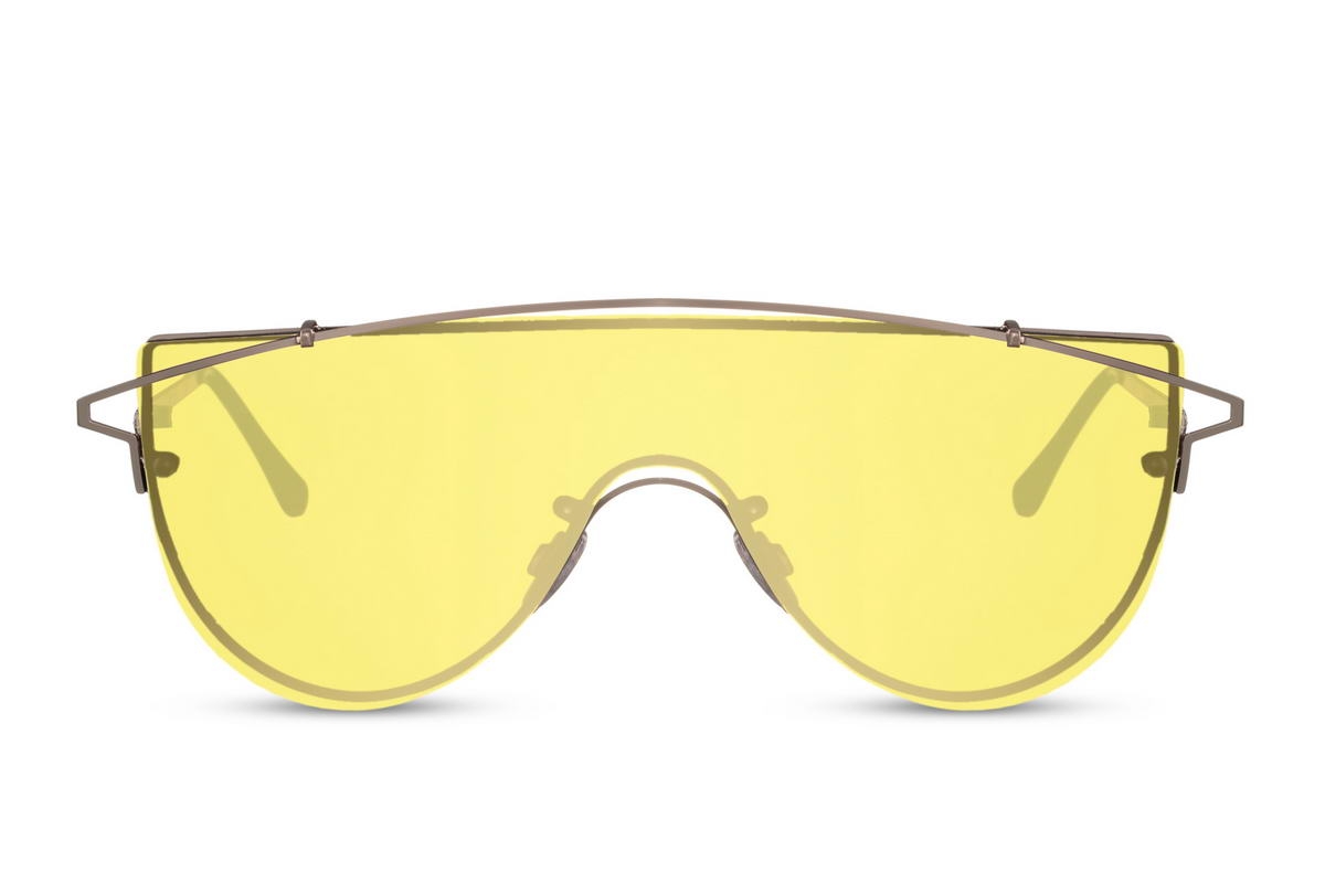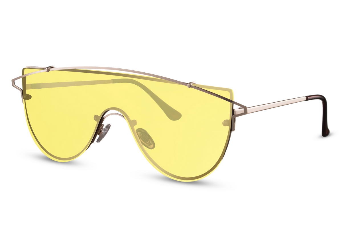 Išskirtinio dizaino ryškūs geltonos spalvos moteriški akiniai nuo saulės su UV apsauga.