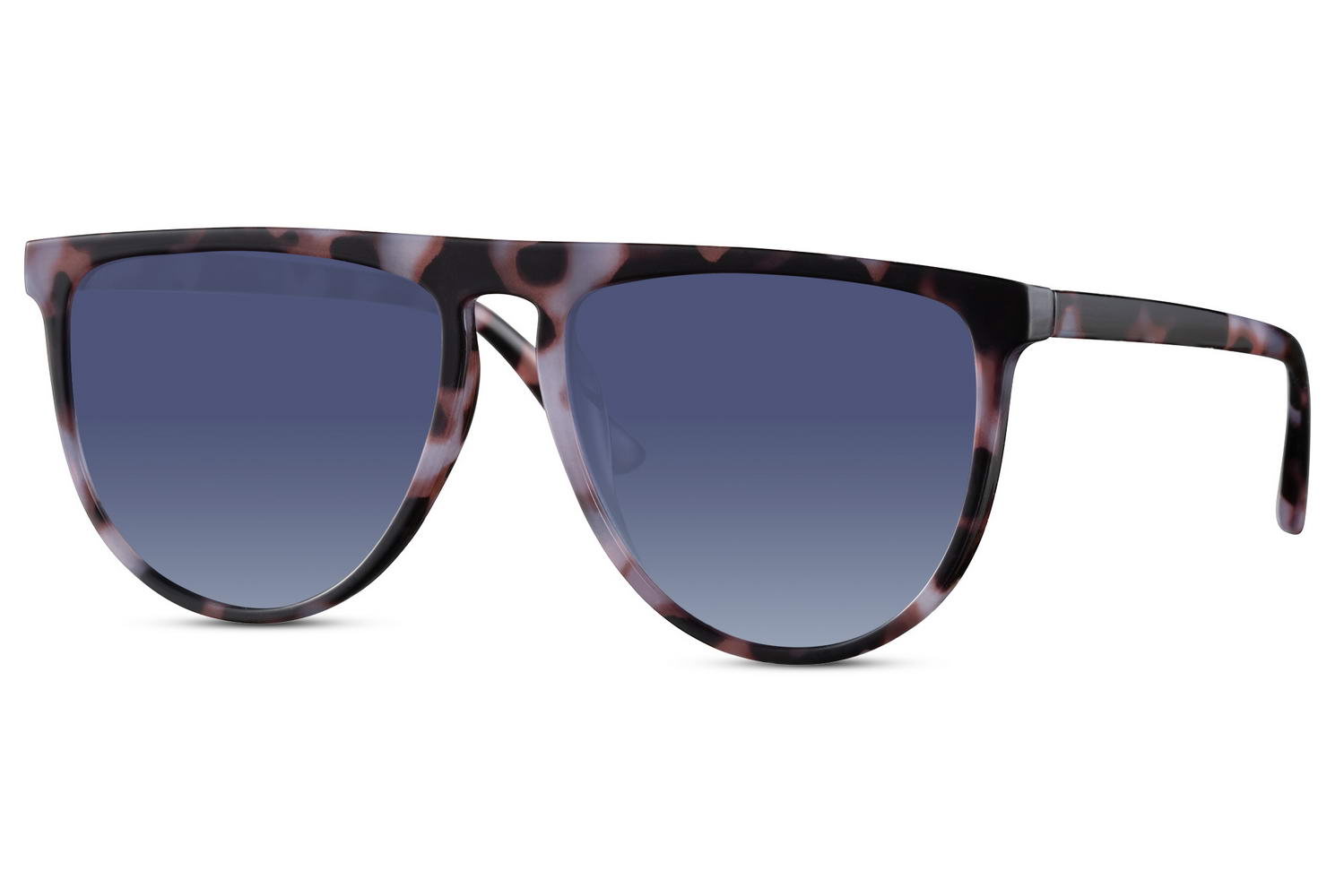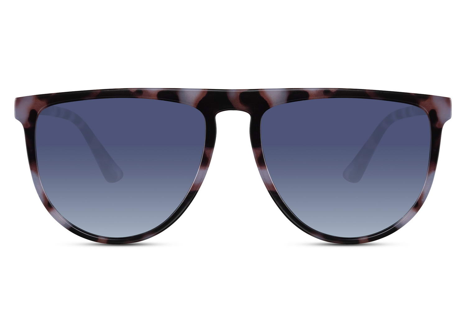 Mėlynų lęšių ir raštuoto korpuso moteriški akiniai nuo saulės su UV apsauga.