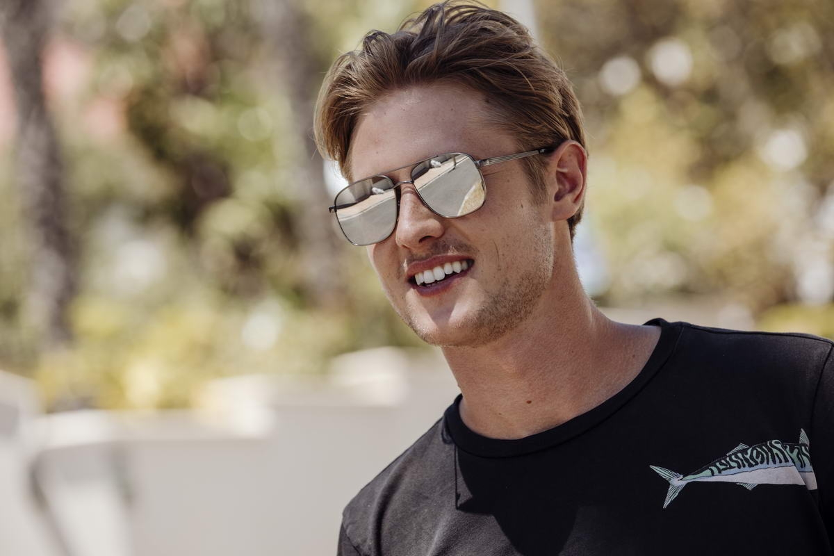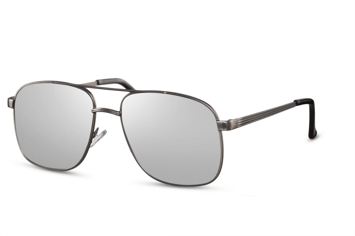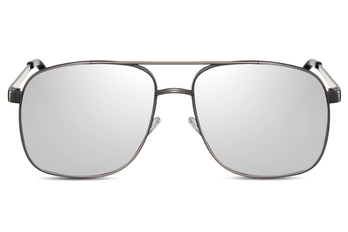 Kvadratinių formų akiniai nuo saulės su metaliniu korpusu ir pilkais veidrodiniais lęšiais.