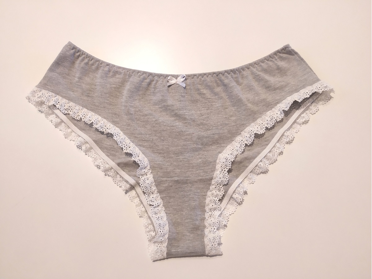 Pilkos spalvos kelnaitės moterims su baltais nėrinukais ties šlaunimis.