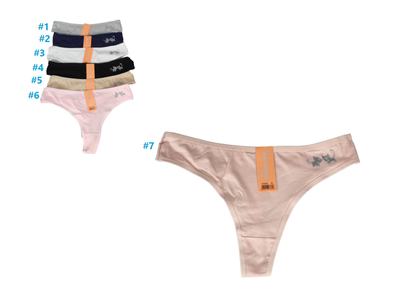 Patogūs ir elastingi stringai su kačiukų simboliais ant klubų.