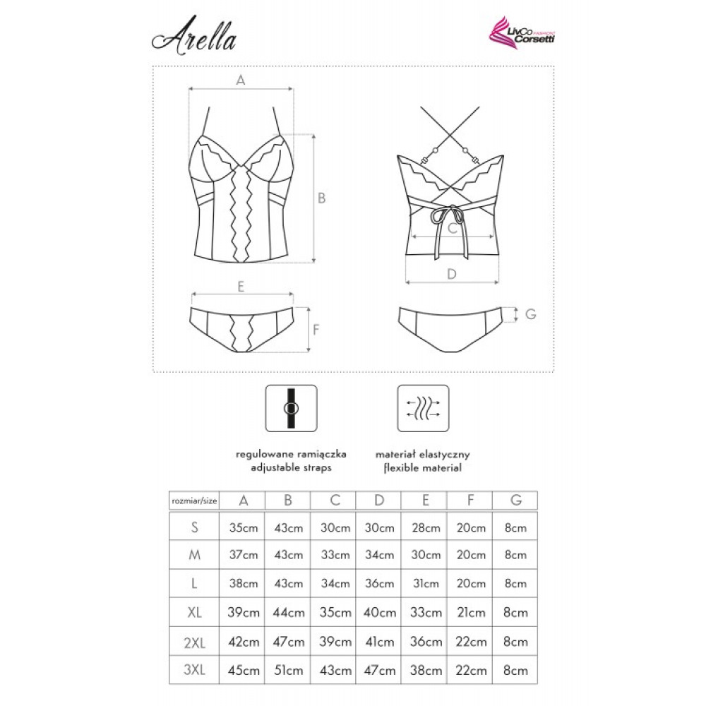 Dviejų dalių rinkinys su viliojančiais permatomais motyvais. Rinkinį sudaro marškinėliai ir kelnaitės. Rinkdamiesi dydį atkreipkite dėmesį į nuotraukose pateiktą dydžių lentelę.