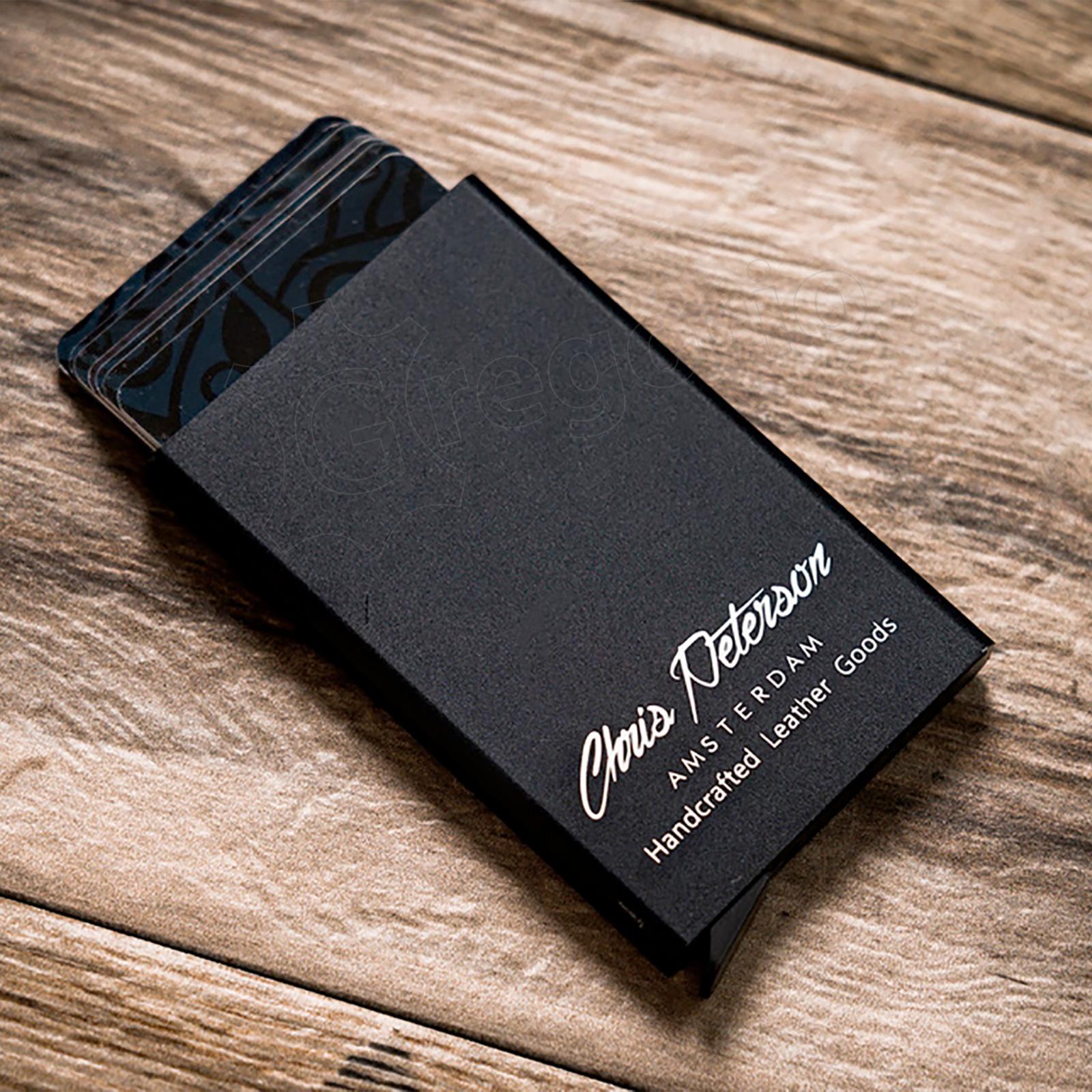 Šis kortelių dėklas ypatingas tuo, kad patraukus svirtelę iš jo išlenda visos viduje esančios kortelės, iš kurių galima išsirinkti reikiamą.