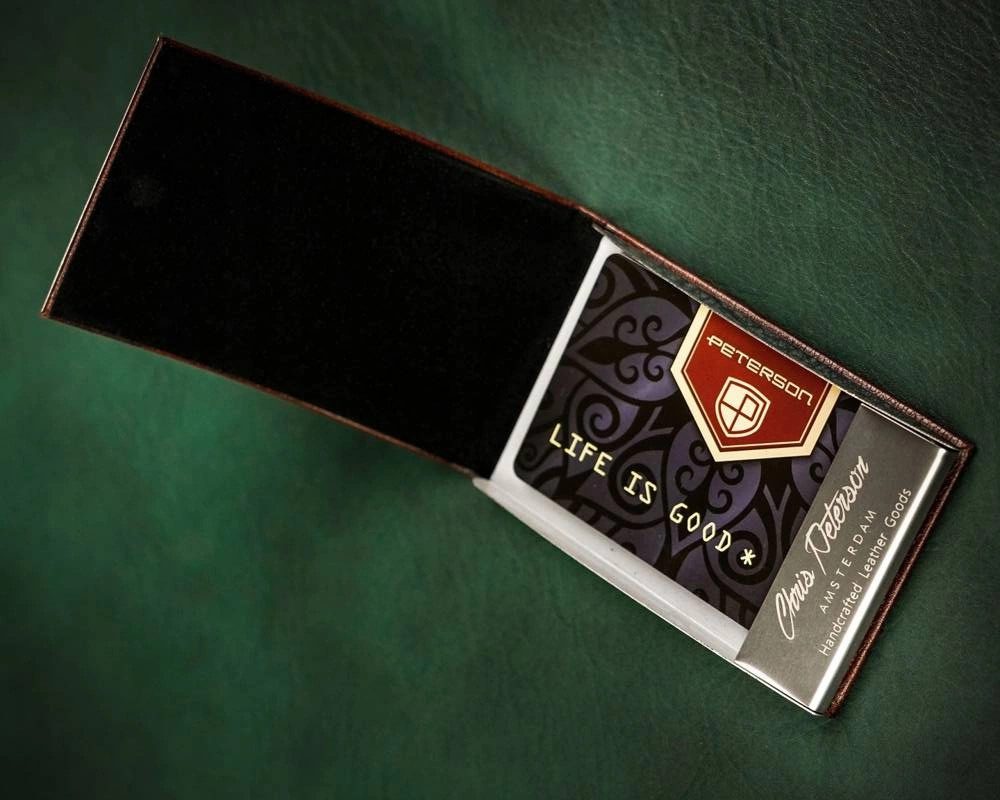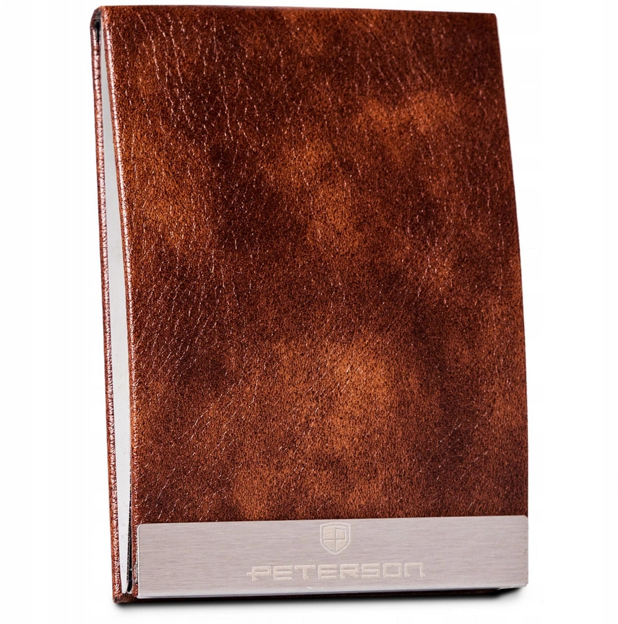 Dirbtinės odos ir metalo kortelių dėklas su magnetiniu užsidarymu. Talpa – ~7 kortelės. Išmatavimai – 6,5×9,5×1,7 cm.