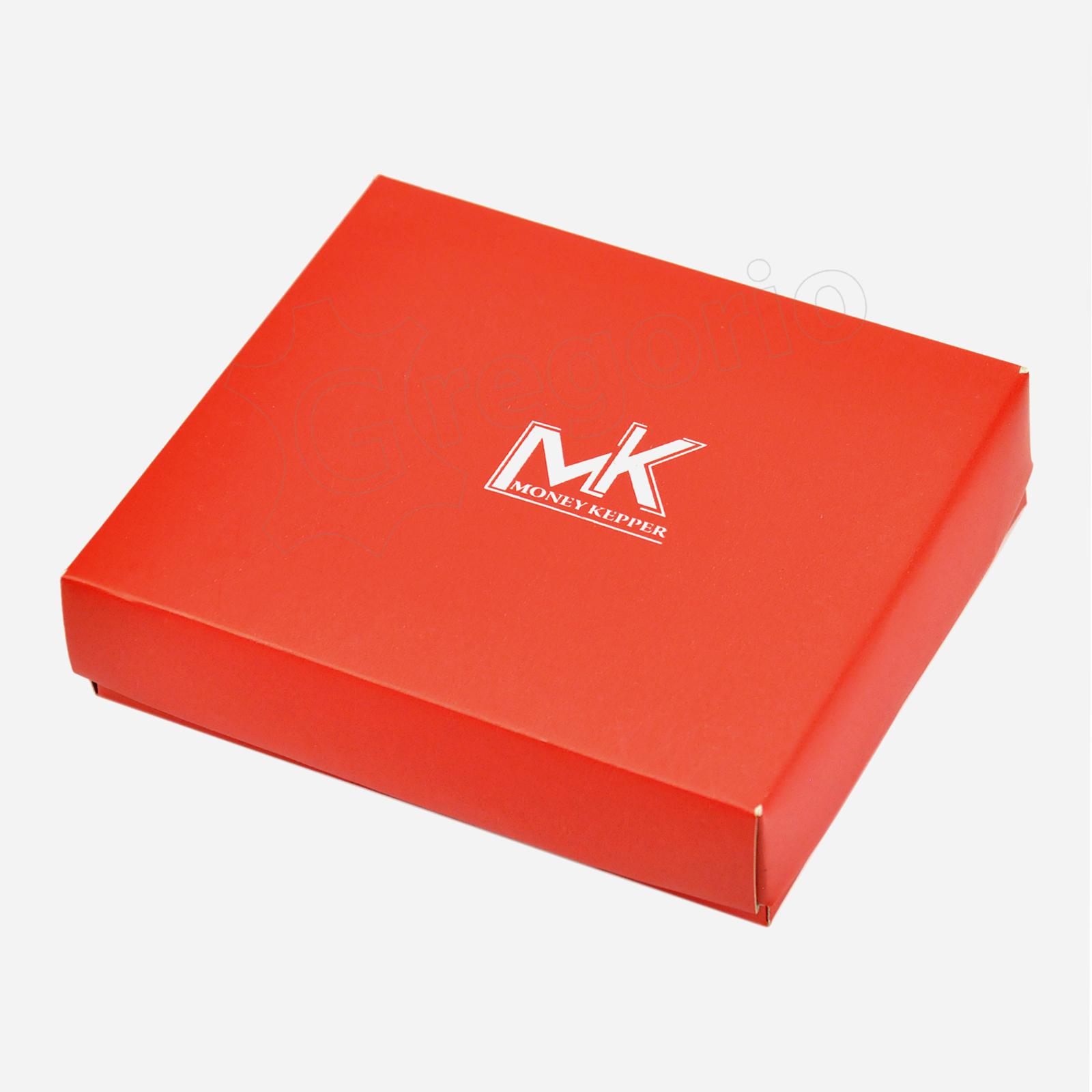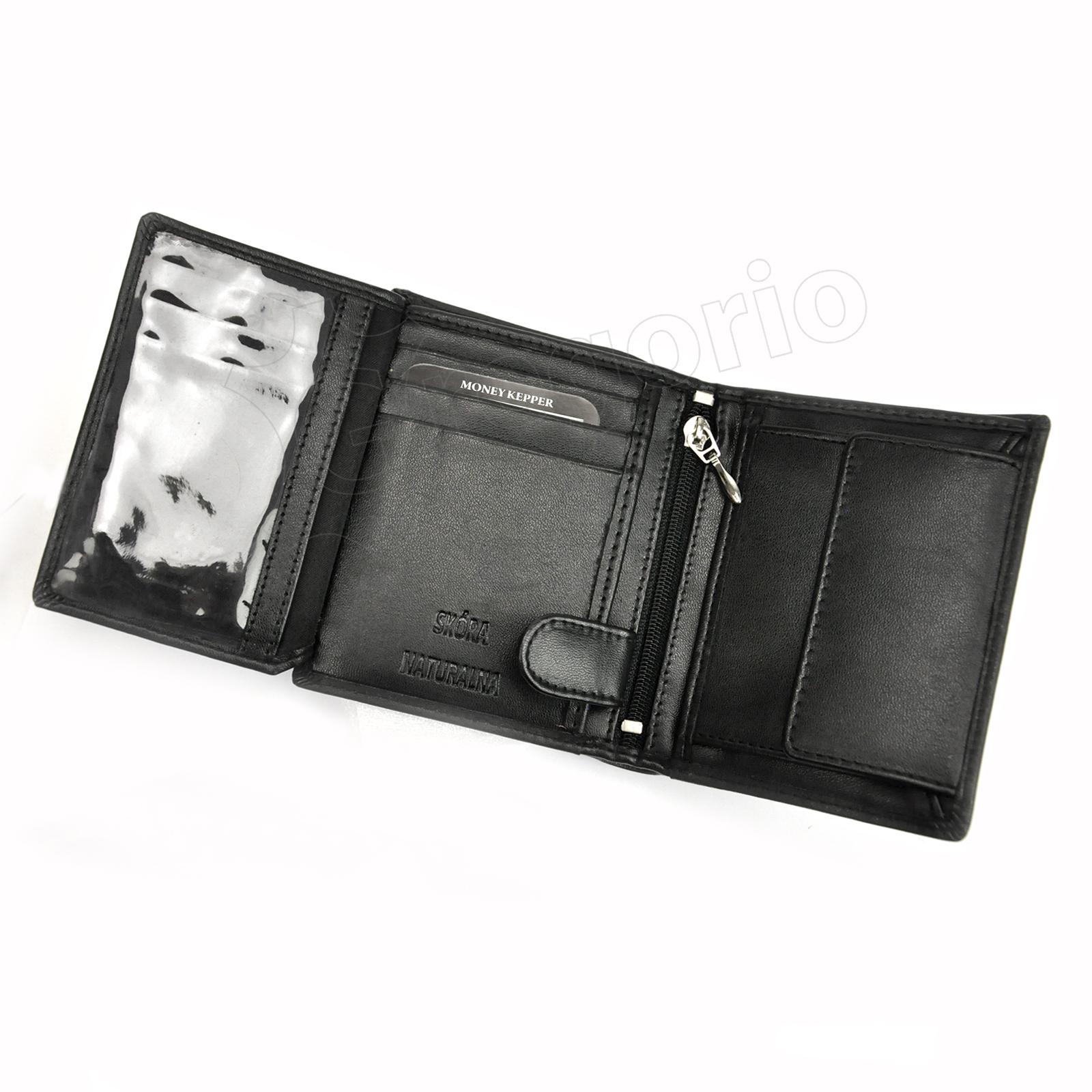 Vyriška juoda natūralios odos piniginė. Viduje gausu skyrelių kortelėms, užsegama centų kišenėlė, banknotų kišenės ir papildoma užtrauktuku užsegama kišenėlė. Piniginė parduodama su dėžute.
