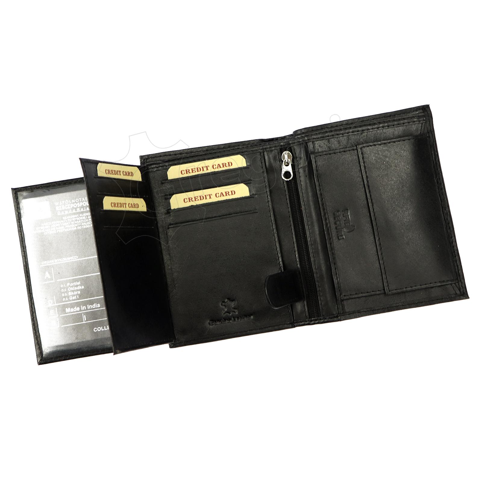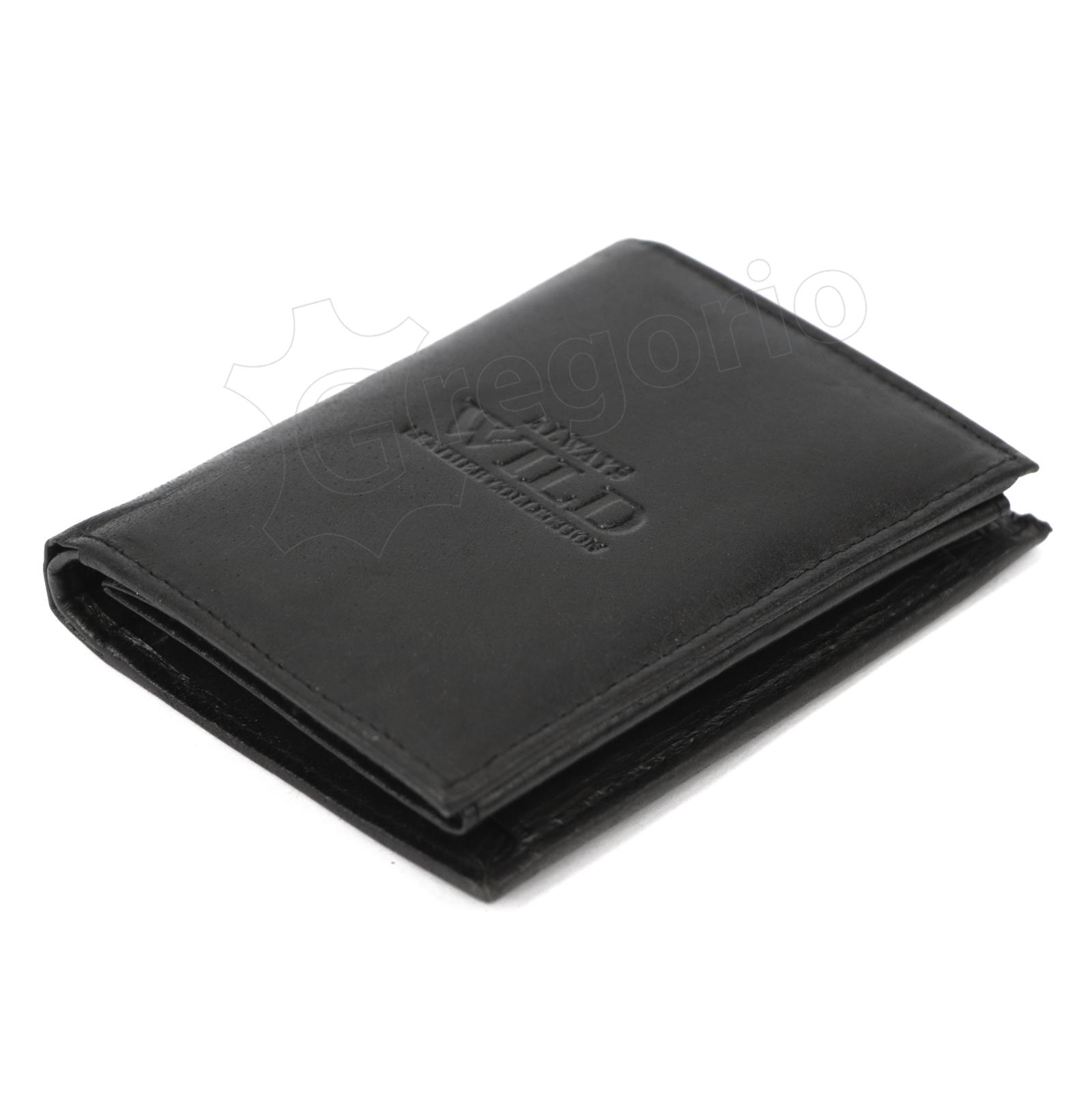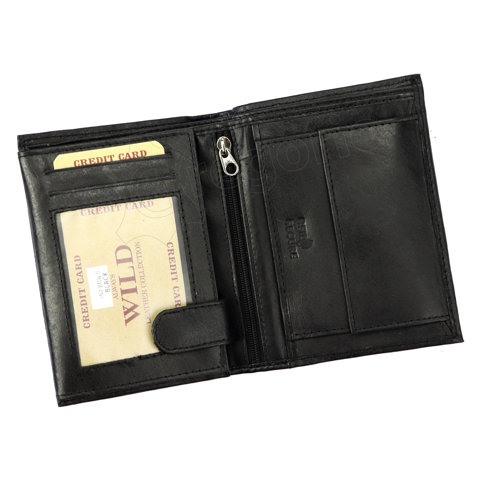 Natūralios odos juodos spalvos vyriška Wild firmos piniginė. Viduje rasite skyrelių kortelėms, užsegamą centų kišenėlę, banknotų kišenes.