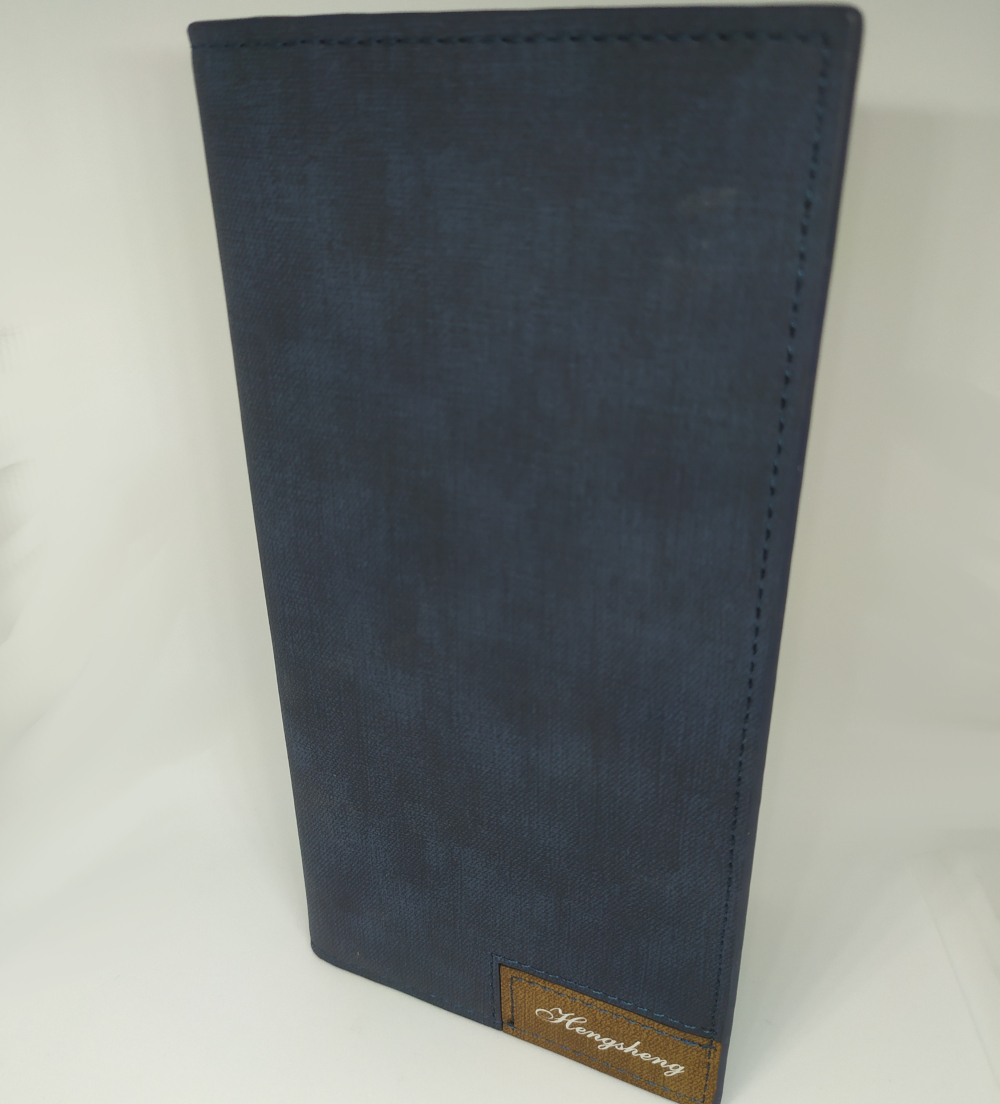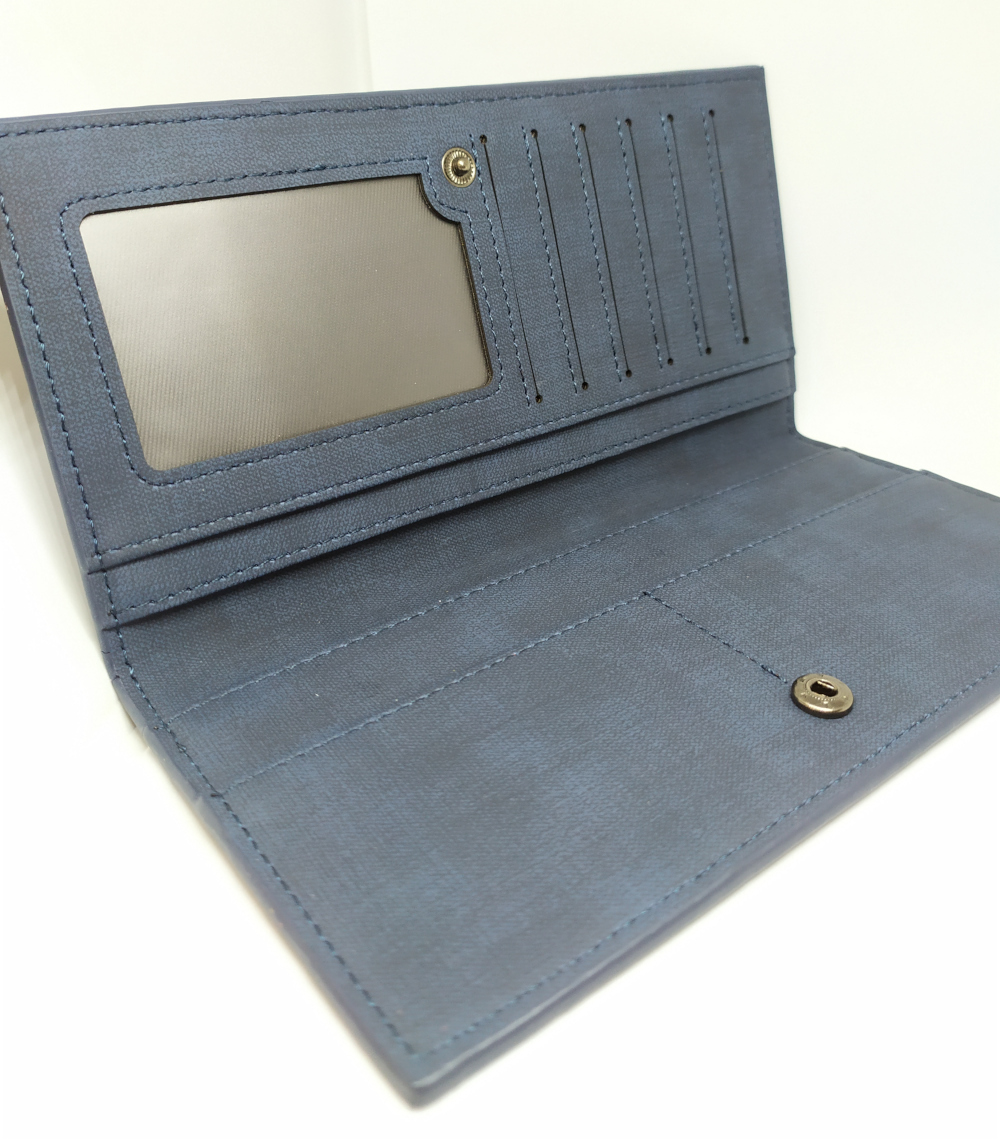 Mėlynos spalvos aukšta piniginė su 8 skyreliais kortelėms ir 3 platesniais skyreliais banknotams ar kitiems dalykams.