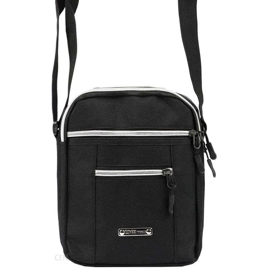 Juodos spalvos vyriška rankinė per petį. Reguliuojamo ilgio dirželis. 4 užtrauktukais užsegami skyriai. Iš jų du dideli viršuje.
