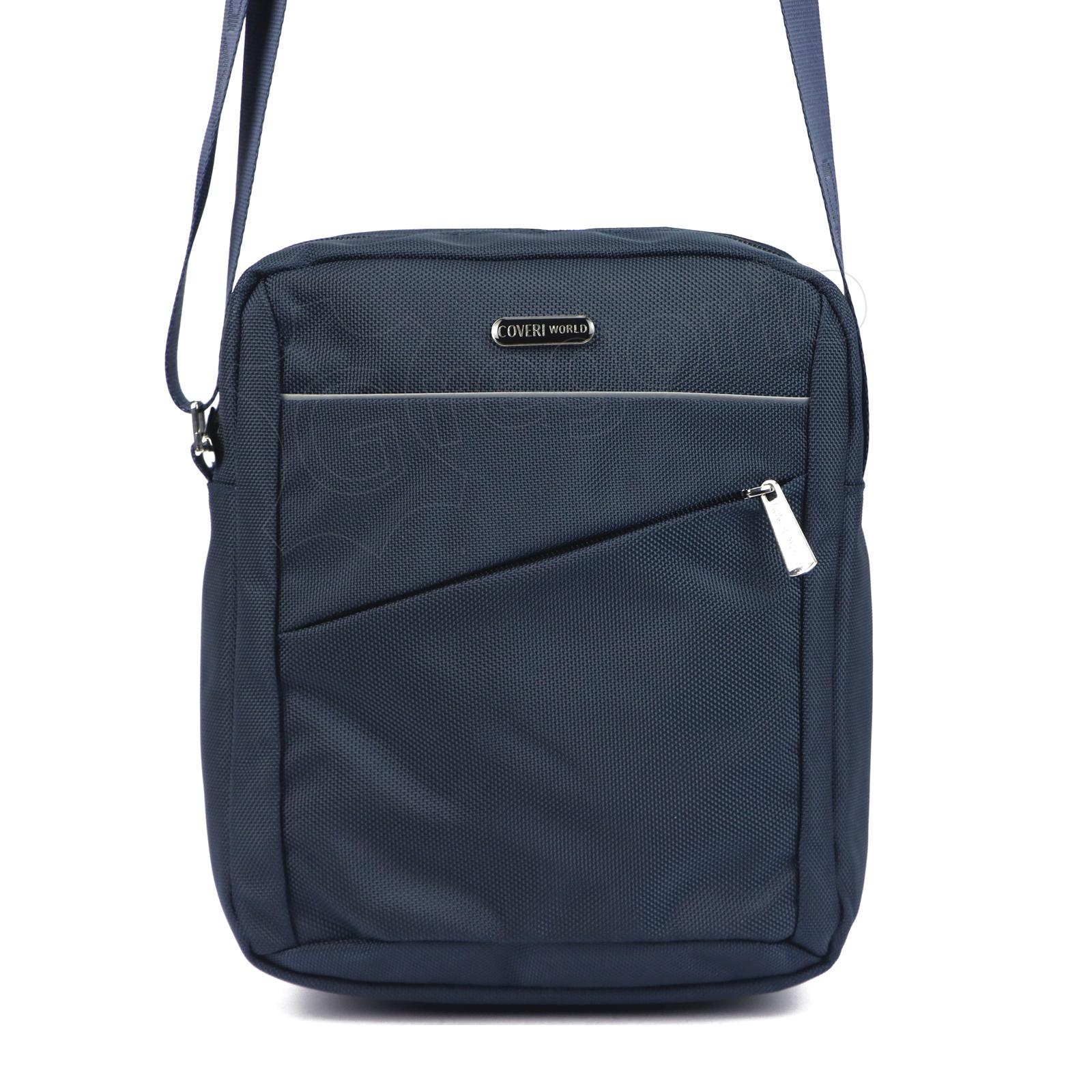 Mėlynos spalvos vyriška rankinė per petį. Reguliuojamo ilgio dirželis. 3 užtrauktukais užsegami skyriai. Vienas pagrindinis ir du priekyje bei gale.