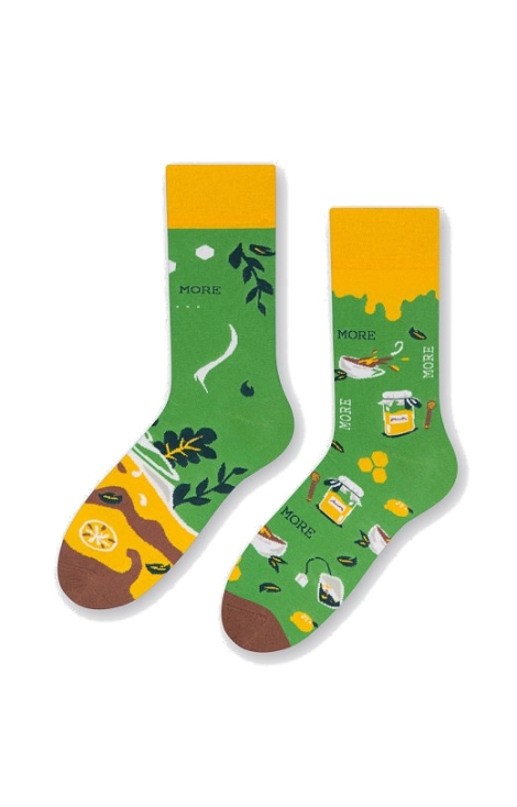 Nuotaikingos kojinės su arbatos ir medaus motyvais. Kojinių sudėtis: 76% medvilnė, 16% poliamidas, 6% polipropilenas, 2% elastanas