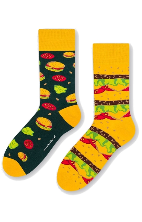 Nuotaikingos kojinės su burgerių motyvais. Kojinių sudėtis: 72% medvilnė, 16% poliamidas, 10% polipropilenas, 2% elastanas