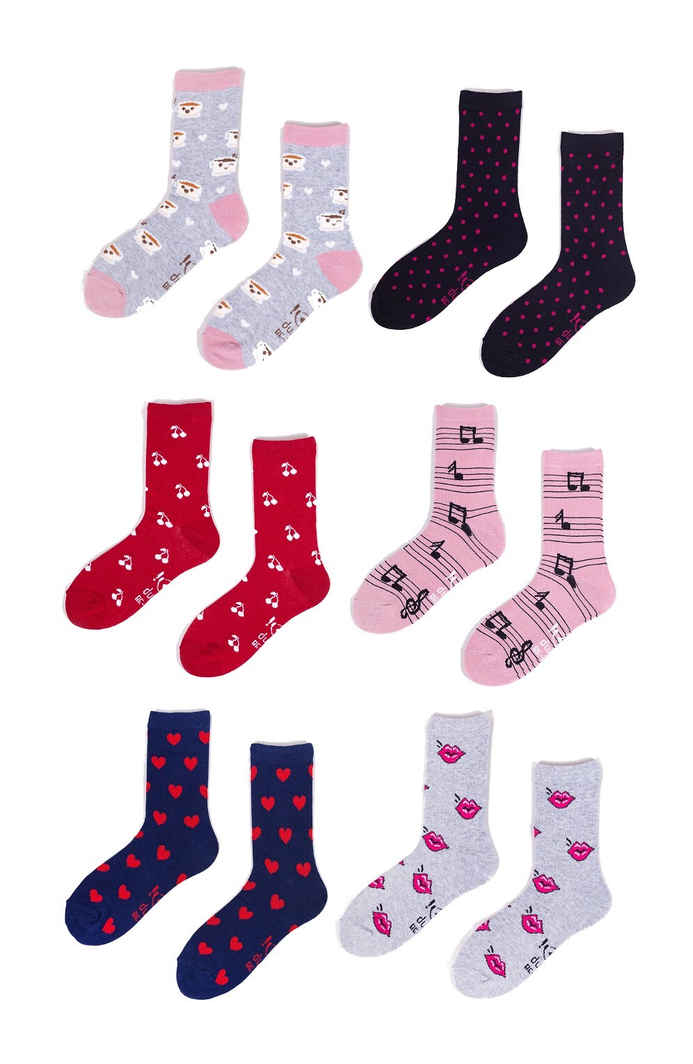 Spalvingų ir nuotaikingų kojinių rinkinys. Pakuotėje – 6 poros kojinių. Kiekviena pora skirtingo stiliaus. Sudėtis: 70% medvilnės, 25% poliamido, 5% elastano