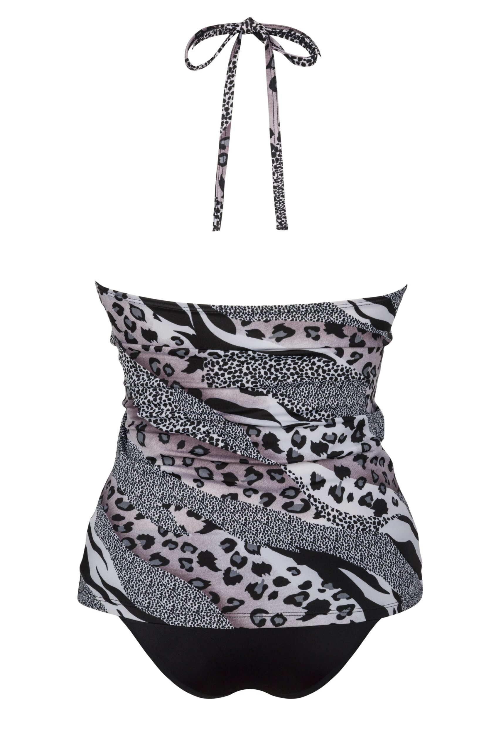 Dviejų dalių maudymosi kostiumėlis. Viršutinė dalis yra marškinėlių tipo ir uždengia pilvuką iki pat kelnaičių.