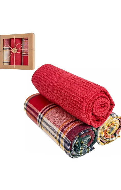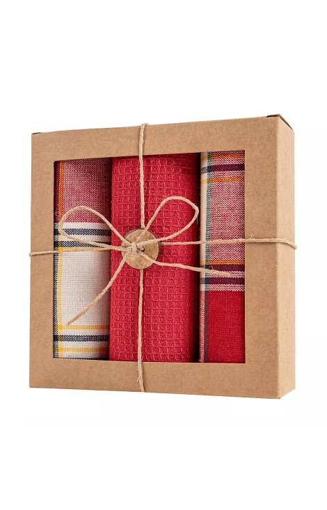 Dovanų dėžutėje supakuotų virtuvinių rankšluosčių rinkinys. Viso – 3 rankšluosčiai. Vieno rankšluosčio išmatavimai – 40×70 cm. Sudėtis: 100% medvilnė.