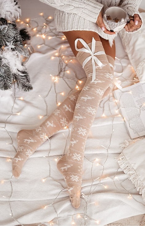 Stilingos ir patogios Kalėdinės moteriškos kojinės virš kelių. Kojinių viršuje – dailus kaspinas. Universalaus dydžio, atitinkančio 37-91 dydį. Sudėtis: 75% medvilnė, 20% poliamidas, 5% elastanas.