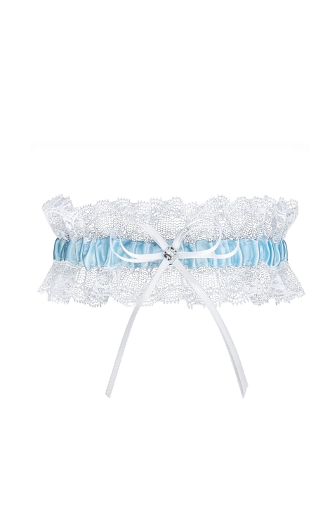 Žydros ir baltos spalvos keliaraištis su kaspinėliu ir blizgiu akmenuku viduryje. Tampri guma tinka įvairios apimties šlaunims.