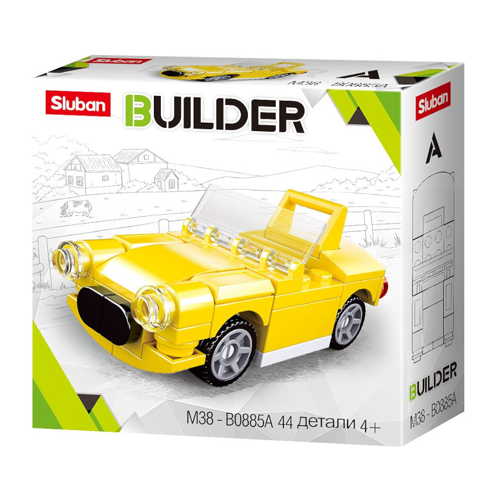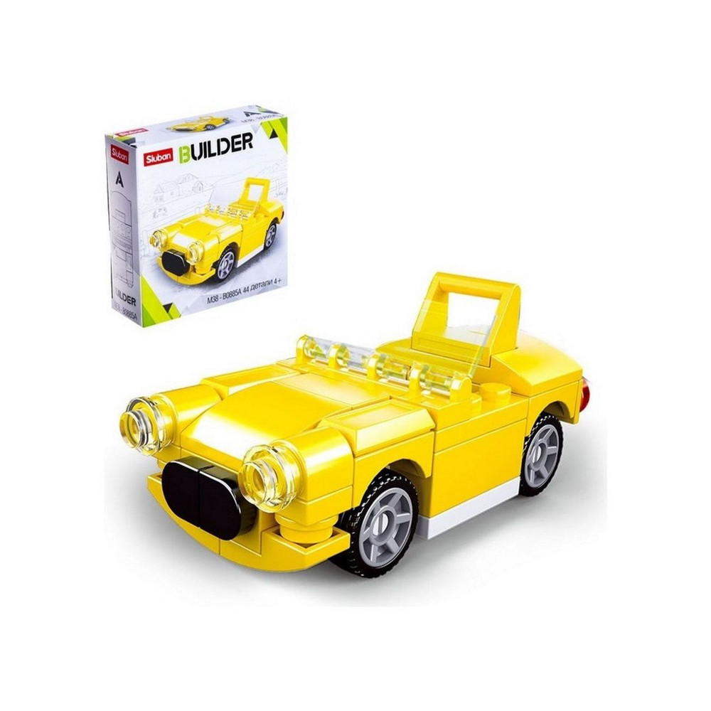 Geltonos spalvos automobilio konstruktorius vaikams. Rekomenduojamas statytojo amžius – 4-8 metai. Dėl smulkių detalių netinkamas vaikams iki 3 metų. Viso – 44 detalės. Pastatytos mašinėlės ilgis – 7,8 cm. Konstuktoriaus detalės pilnai suderinamos su daugumos kitų gamintojų konstruktoriais, tarp jų ir LEGO.