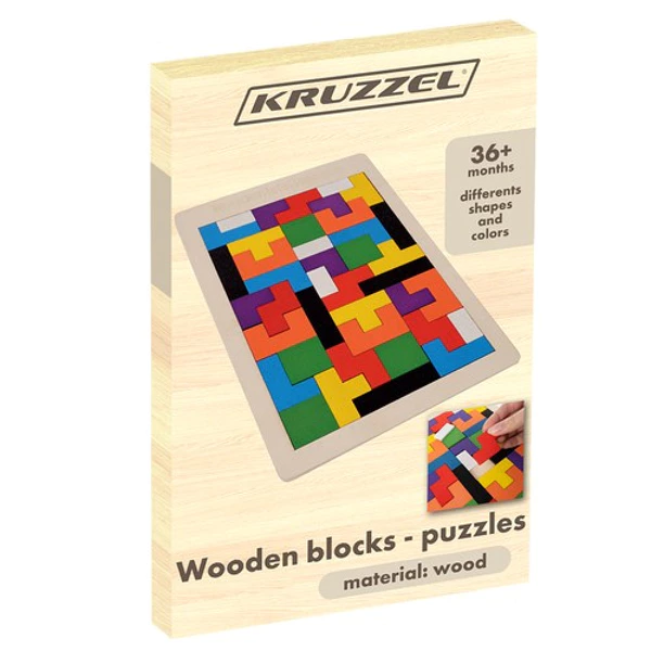 Medinė Tetris pobūdžio dėlionė su spalvotomis detalėmis. Dėlionę galima dėti įvairiais būdais ir visi būdai yra teisingi iki tol, kol nelieka nei vienos nepanaudotos detalės. Tinkama vaikams nuo 3 metų. Dėlionės išmatavimai – 27 x 18 cm.